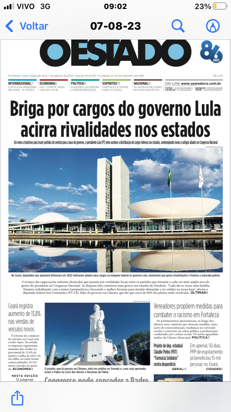 O jornal diário O Estado, que há 86 anos é editado em Fortaleza, traz hoje (segunda, 07/08) uma primeira página capaz de atrair a atenção e o interesse de leitores potenciais e do mercado editor.